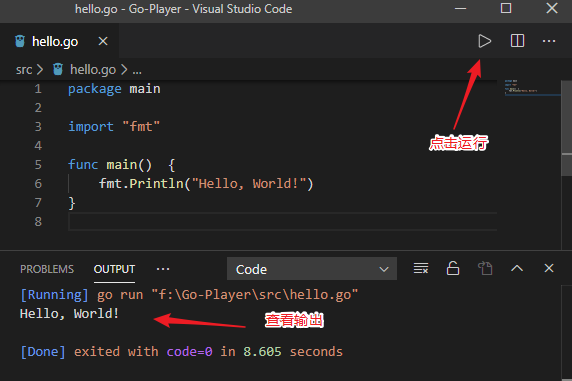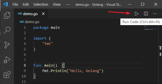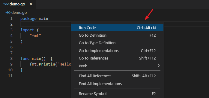}使用 Ctrl + Alt + N ,或者右键选择 Run Code 就可以执行该 go 文件。
