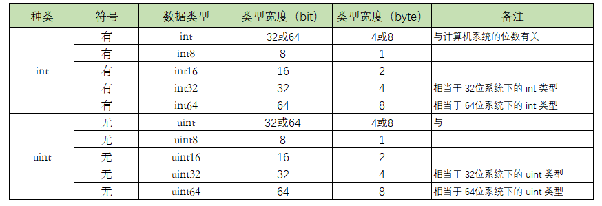int 和 uint 的区别就在于一个 u,有 u 说明是无符号,没有 u 代表有符号。