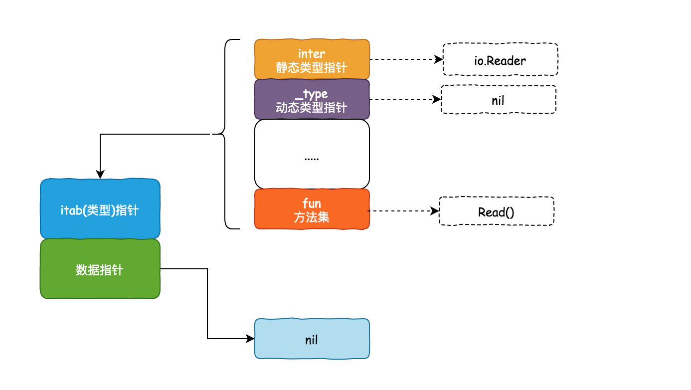 第一行代码:var reader io.Reader ,由于 io.Reader 接口包含 Read 方法,所以 io.Reader 是 iface,此时 reader 对象的静态类型是 io.Reader,暂无动态类型。