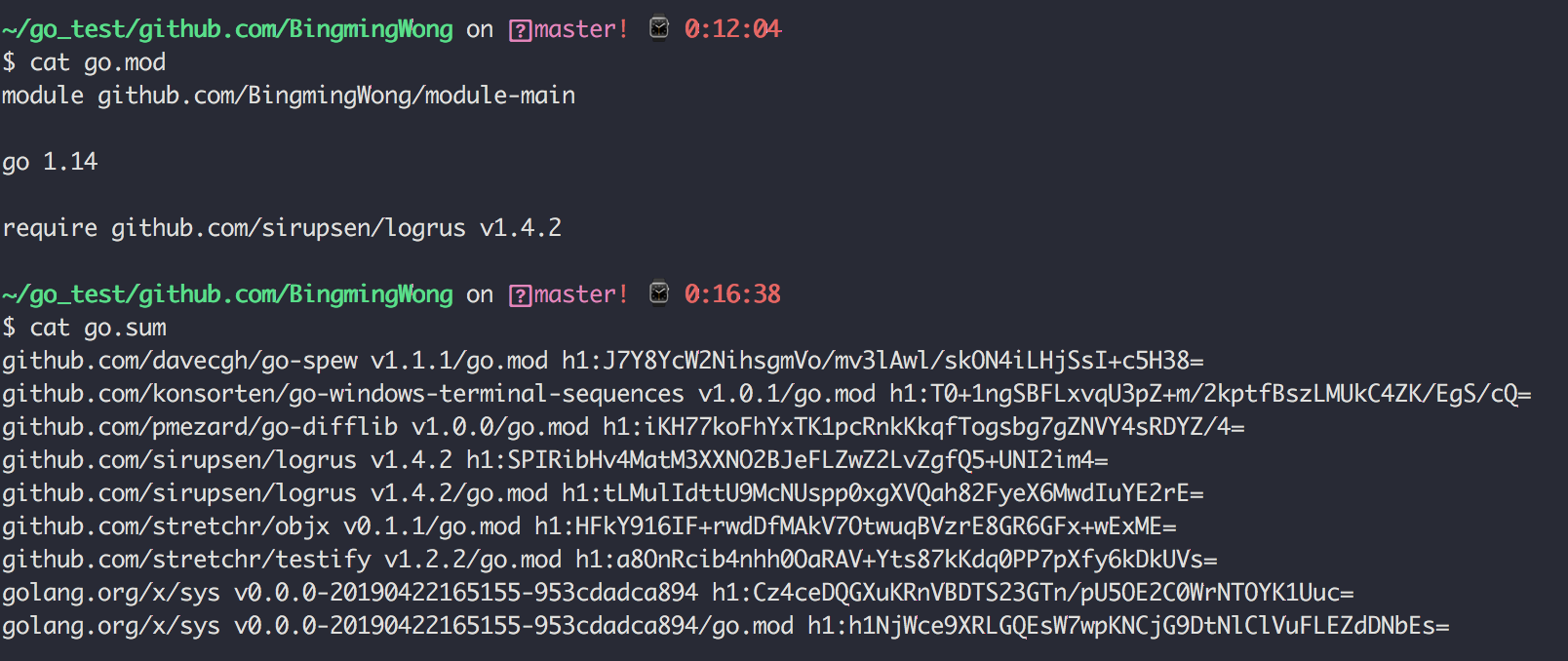 上面我们观察到,在使用 go modules 模式后,项目目录下会多生成两个文件也就是 go.mod 和 go.sum 。