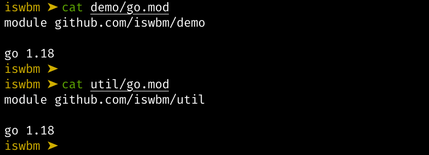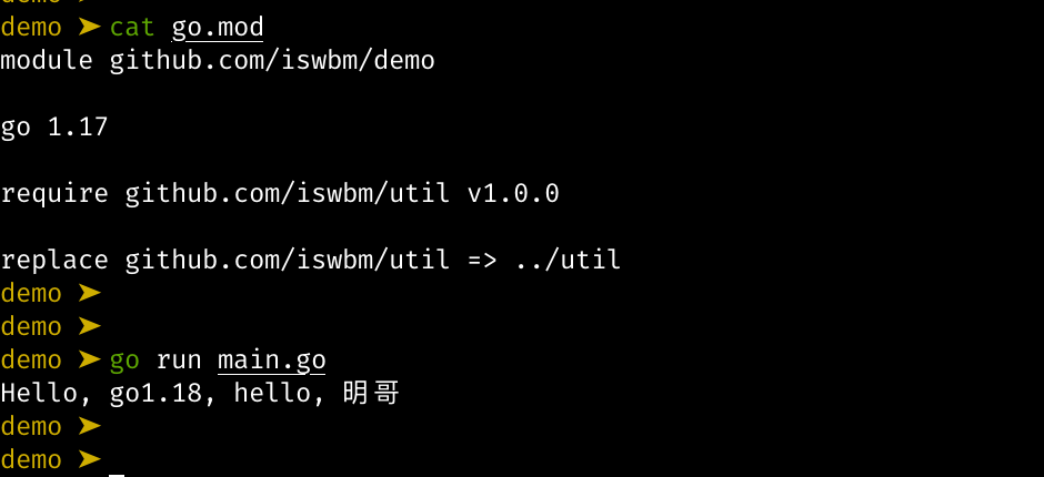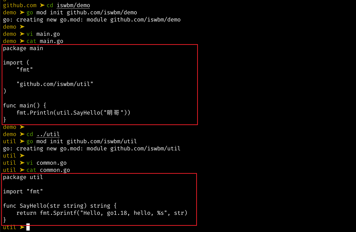 $ go mod init github.com/eddy5885/util并在 demo 中写入 main.go,在 util 写入 util.go ,内容如下