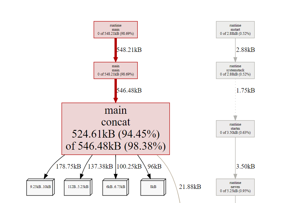 gopackage main import ( "github.com/pkg/profile" "math/rand" ) const letterBytes = "abcdefghijklmnopqrstuvwxyzABCDEFGHIJKLMNOPQRSTUVWXYZ" func randomString(n int) string { b := make([]byte, n) for i := range b { b[i] = letterBytes[rand.Intn(len(letterBytes))] } return string(b) } func concat(n int) string { s := "" for i := 0; i < n; i++ { s += randomString(n) } return s } func main() { defer profile.Start(profile.MemProfile, profile.MemProfileRate(1)).Stop() concat(100) }
